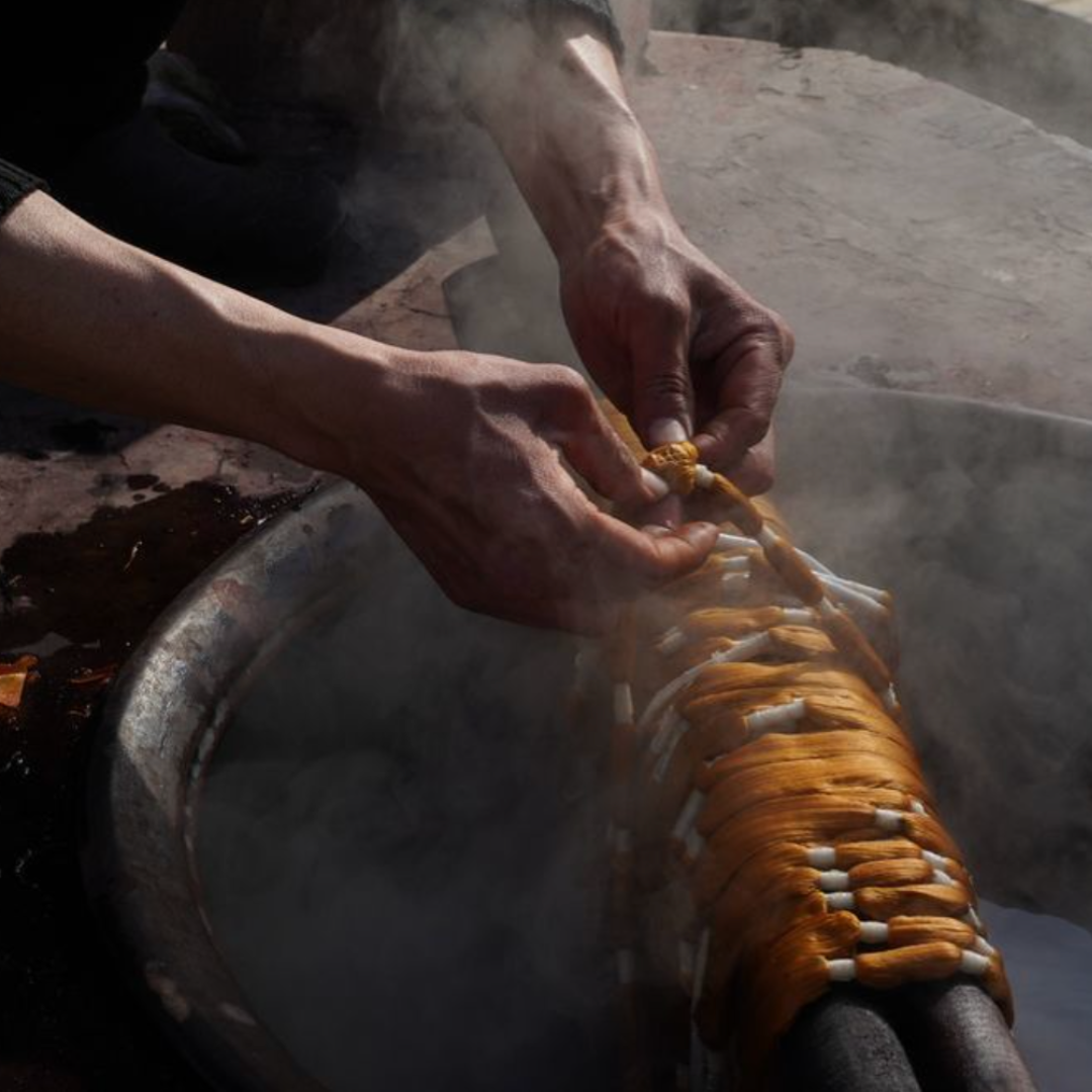 Artisians wrap with transparent adhesive tape those areas that need to be covered. Tape protects areas from the dye, creating the pattern. Each dip in the dye bath reveals a little more of the final design. It takes time, but the vibrant colours are worth the wait!