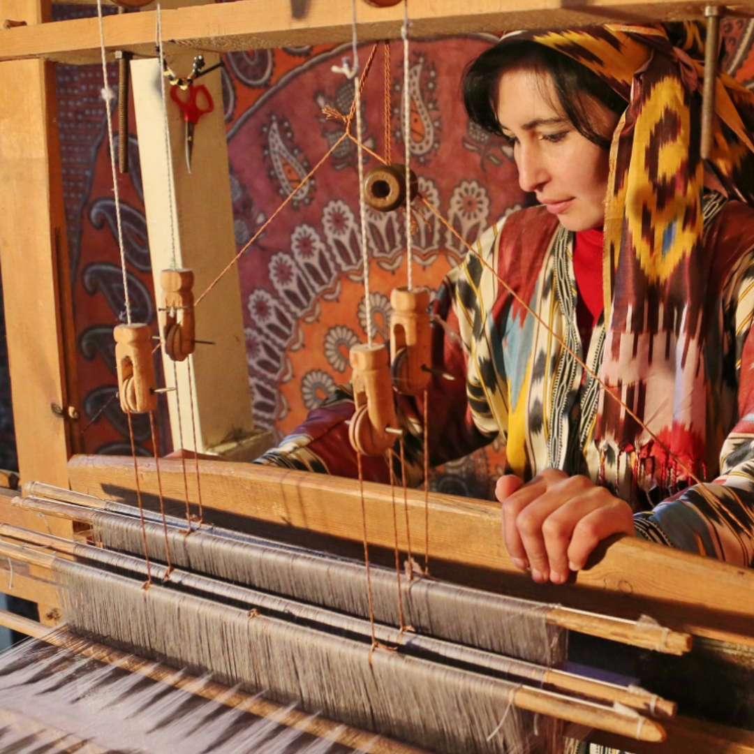We source our fabrics from Uzbekistan, where the age-old techniques of hand-producing ikat remain alive. Each thread of cotton or silk is lovingly twisted and woven by hand, then dyed with the brilliance of natural pigments.